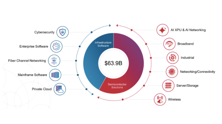 A portfolio of mission-critical enterprise software assets characterized by high renewal rates and strong cash flow generation. This segment makes up approximately 35% of Broadcom’s revenue while helping offset semiconductor cyclicality and supports consistent capital return.